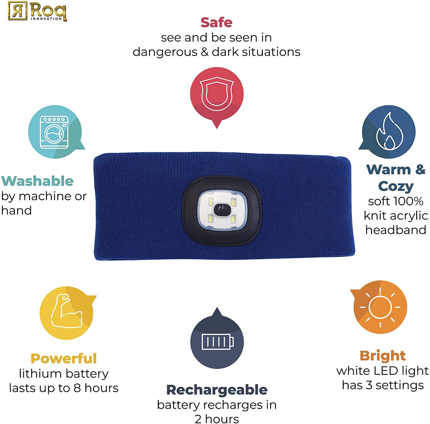 We’ve improved our classic, flagship beanie to create the newest Headlightz® offering from Roq Innovation - the patent-pending Headlightz® Knit Headband. This compact headband is designed to feature our innovative integrated bright white LED light that is lightweight, removable, and USB-rechargeable. Choose one of three brightness levels, and the battery will last between approximately 1.75 and 8 hours. Recharging is super easy, and there are no cords to lose. The light flashes as it charges and is lit solid when the battery is fully charged.